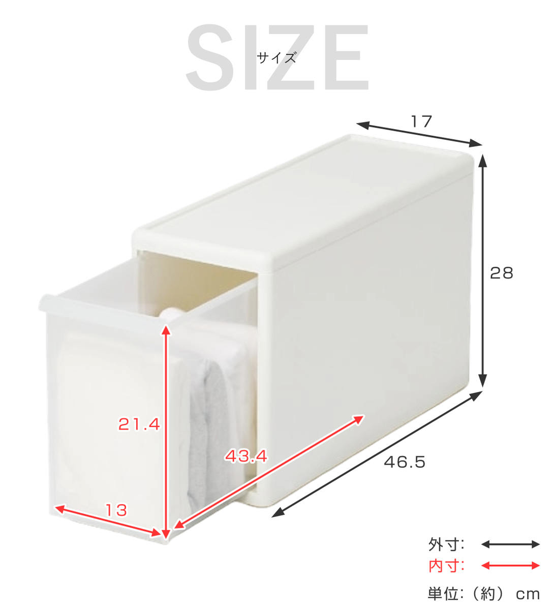 | サイズ | 約 幅17×奥行46.5×高さ28(cm) 引き出し内寸:約 幅13×奥行43.4×高さ21.4(cm) |