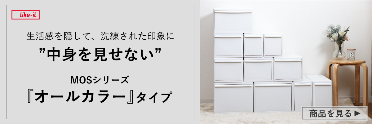 3種類の幅の異なる収納ケースでも積み重ねができるスタッキング構造で、自由にカスタマイズができます。無駄な空間を作らないブロック式構造なので、スッキリとした見た目です。MOSの収納ケースなら、スペースを有効活用したあなただけの「理想の収納」が作れます。
