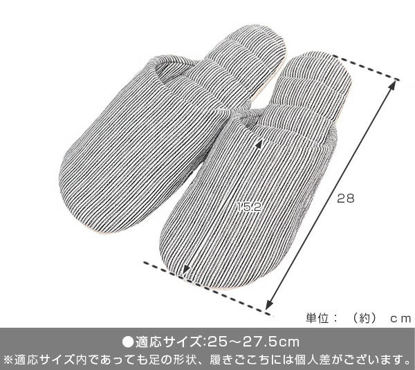 本商品は、約25cm~27.5cmまでの方に合ったサイズ感となっております。適応サイズ内の方でも足幅が広め、甲が高めの方にはスリッパを履いた時にきつく感じる場合があります。ご了承の上、お買い求めください。