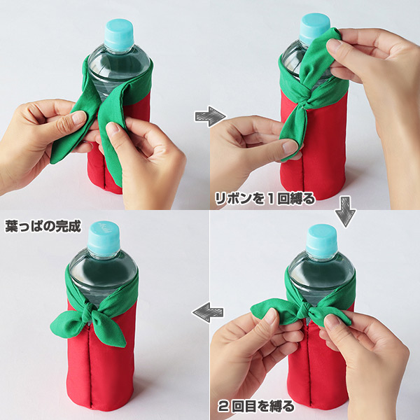 ボトルをいれたら、中央でリボンを二回縛るだけでかわいい葉っぱの完成です。