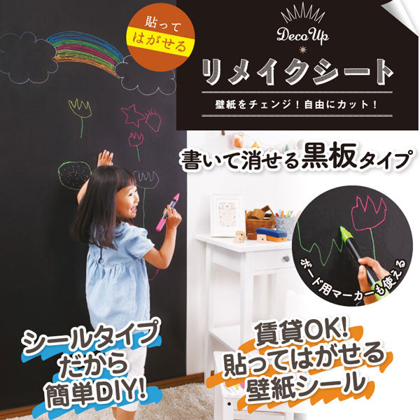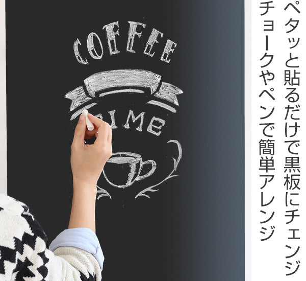 ピタッと貼るだけで、貼った部分が黒板にチェンジするリメイクシートです。お子様がのびのびお絵かきしたり、家族の間でのコミュニケーションボードや、お店のメニューボードにも。使い方は自由自在です。はさみやカッターで自由にカットができ、糊のいらないシールタイプなので、DIY初心者でも気軽にチャレンジすることができます。