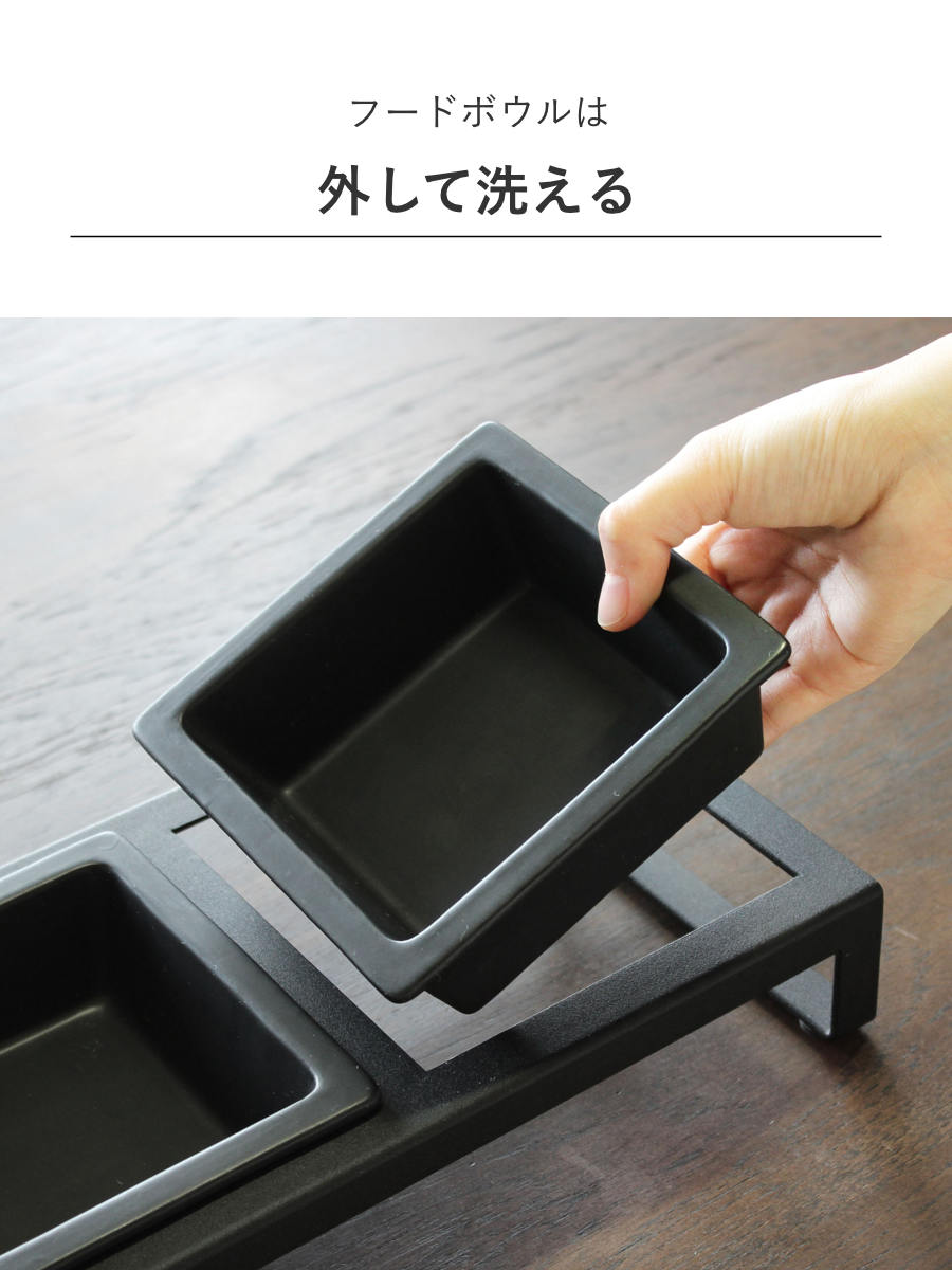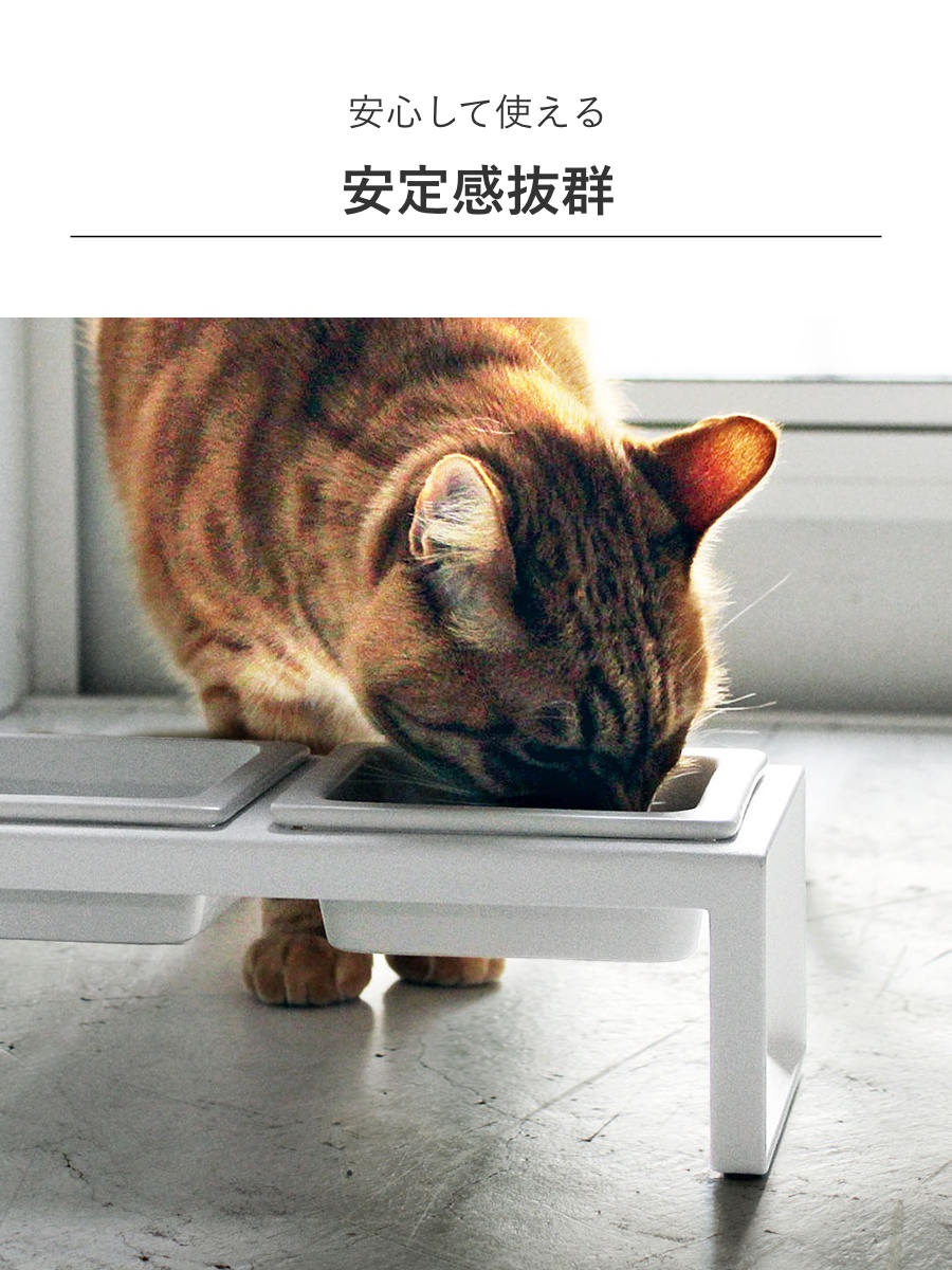 キッチンやリビングのインテリアの邪魔をしないシンプルでスタイリッシュなデザインです。ボウルが2つ付いているので、お水とフード、2種類のフードを入れるなど自由に組み合わせて使えます。