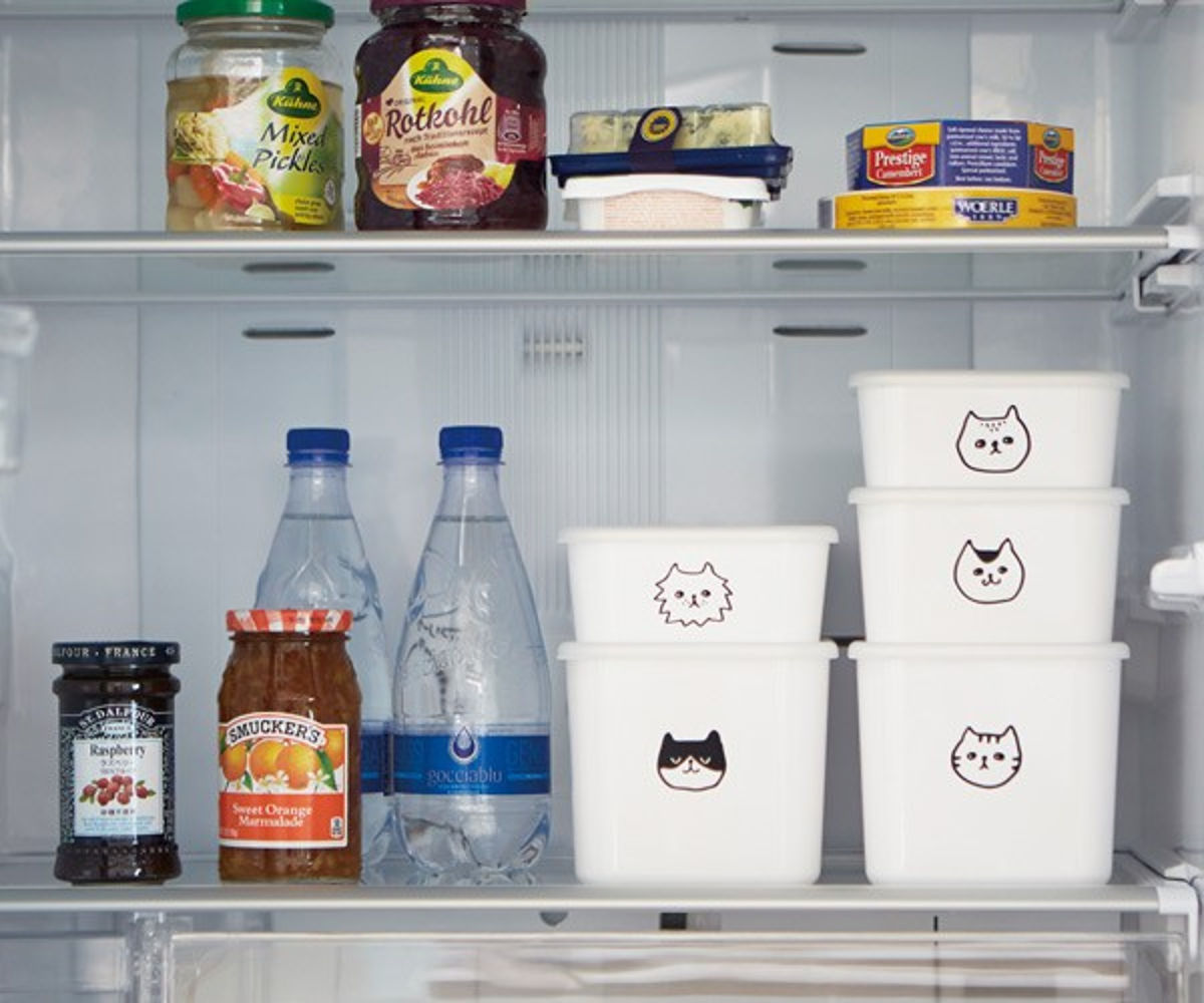 冷蔵庫の中でお行儀良くスタンバイするのは、スペースを有効に使えるスクエアタイプのストッカー。中身をネコの顔で分類する・・・なんて使い方も楽しいです。自然と気分が上がります。