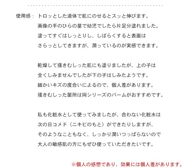 | 備考 | ※着色料、パラベン、香料、アルコール不使用 ※お肌に合わないときはご使用をおやめください ※本品は無香料・無着色です ※色や香りに天然成分に由来するバラつきが生じることがありますが品質には問題ございません |