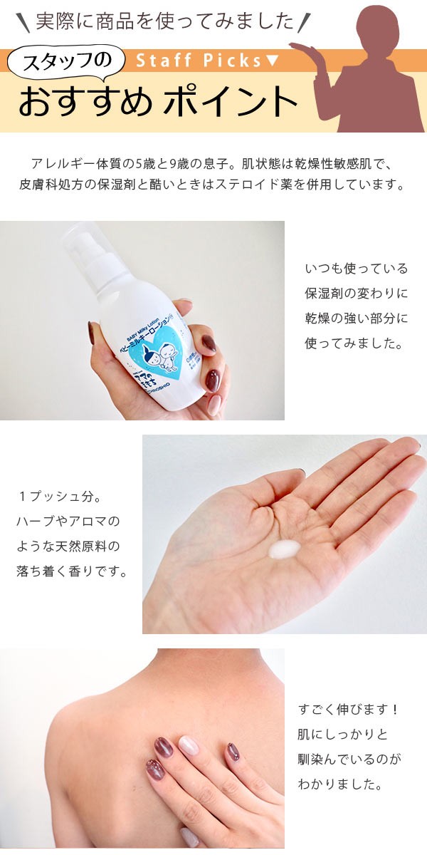 ●大切な赤ちゃんのお肌のために無添加にこだわった乳液タイプのローションです。