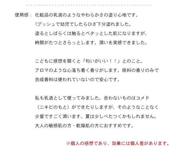 | 備考 | ※鉱物油、防腐剤不使用 ※お肌に合わないときはご使用をおやめください ※色や香りに天然成分に由来するバラつきが生じることがありますが品質には問題ございません |