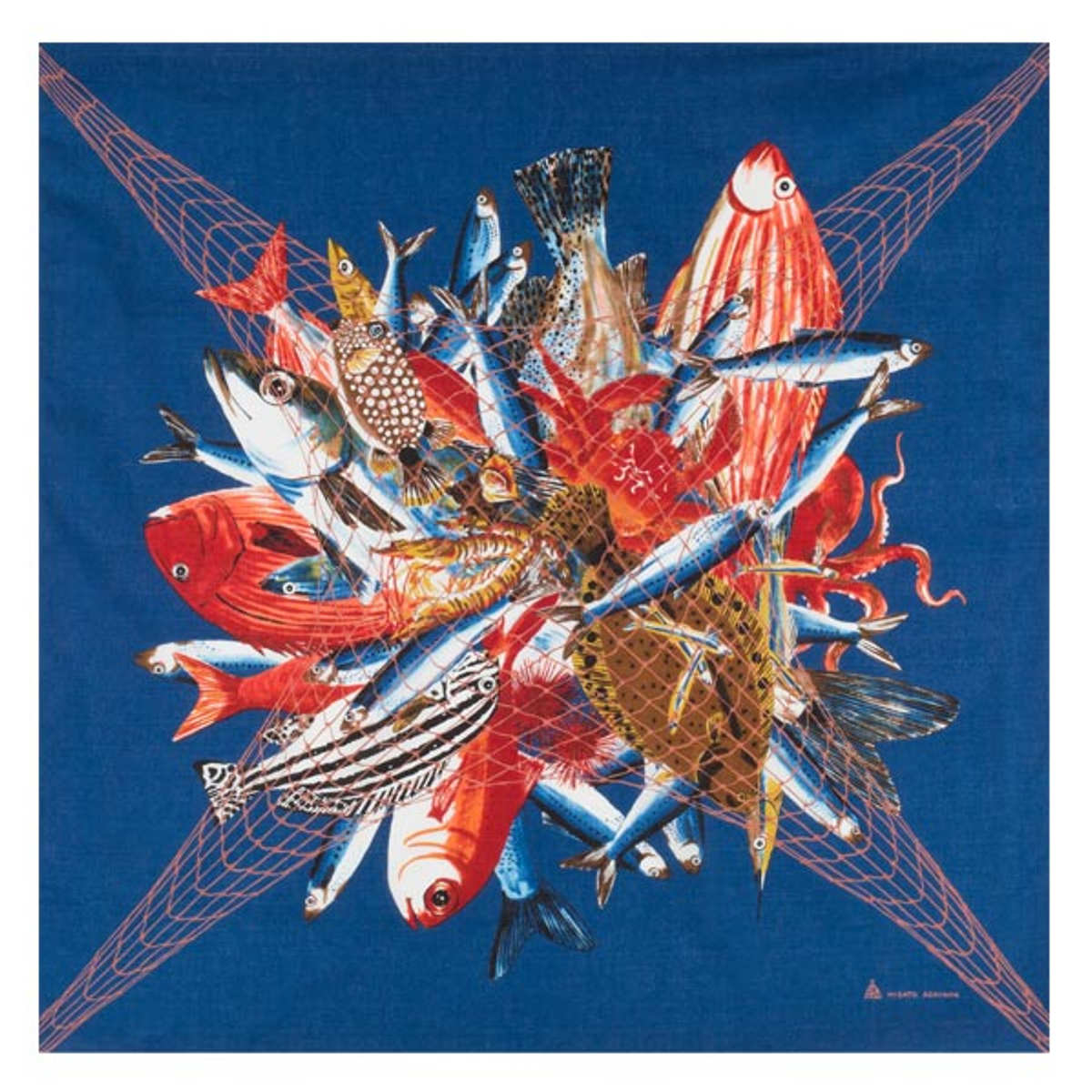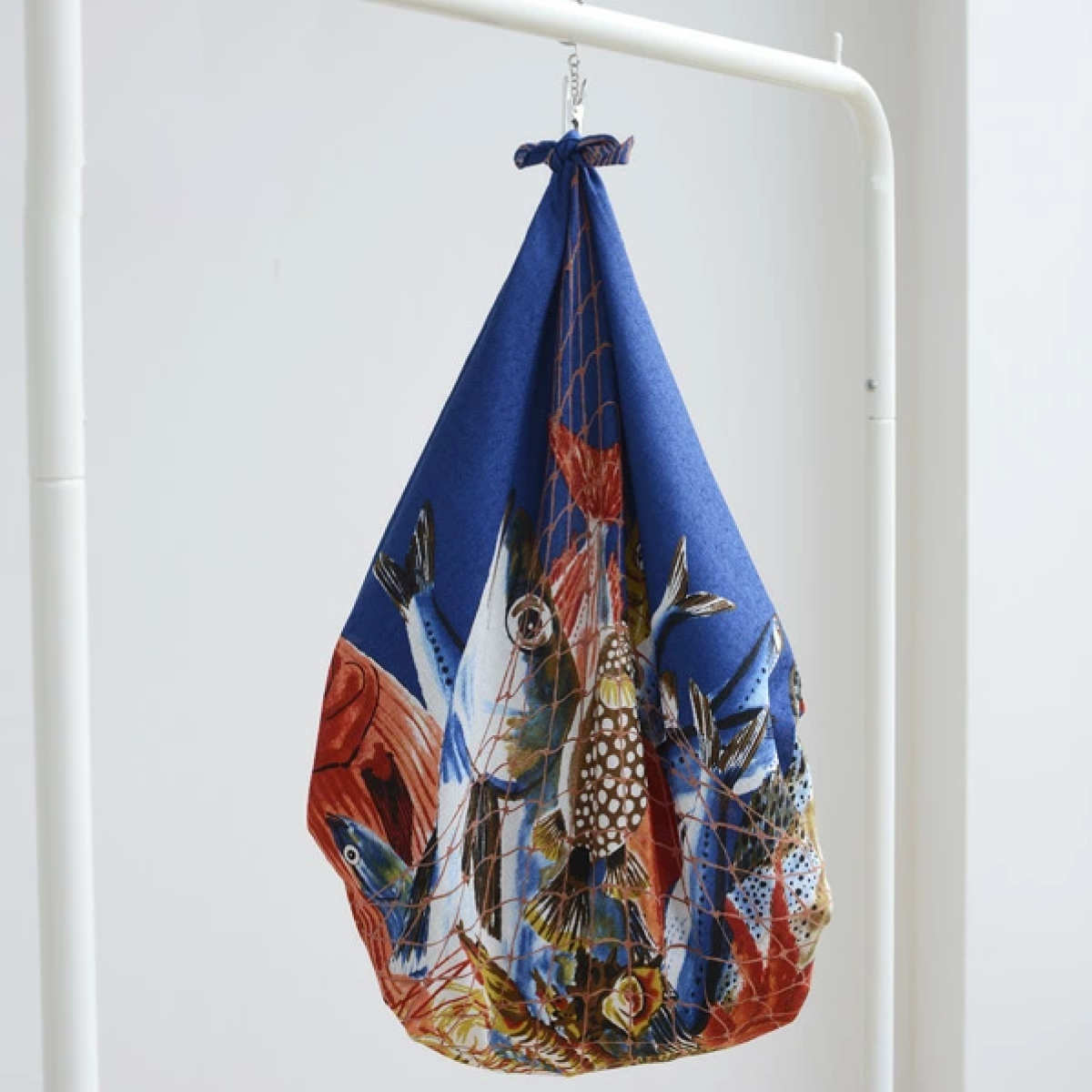捕れたばかりの大量の魚を家に持ち帰っているデザインの風呂敷です。シーハーベストは「海の幸」という意味です。