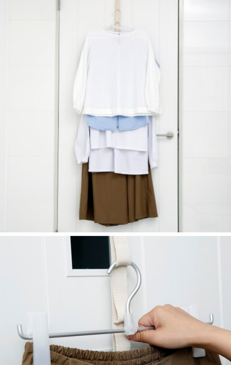 まるで着ているようなイメージで服をチェックできる便利なドアフックです。明日着ていく服をコーディネートしたり、インスタやフリマアプリの出品用に撮影するにも便利です。好きな高さにハンガーが掛けられるので、見せたい角度で服をみせることができます。