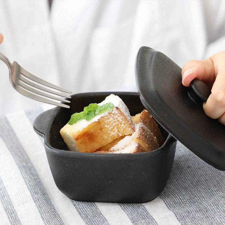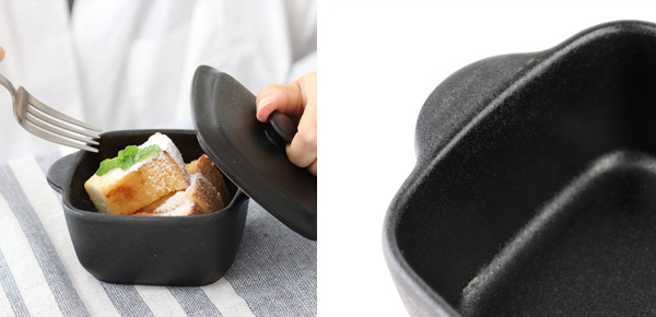 ミニサイズのココット鍋のようなデザインの蓋付き耐熱皿です。パンプディングやミニケーキ、サイドディッシュのオーブン料理、深さがあるのでミニサイズのグラタンも作れます。