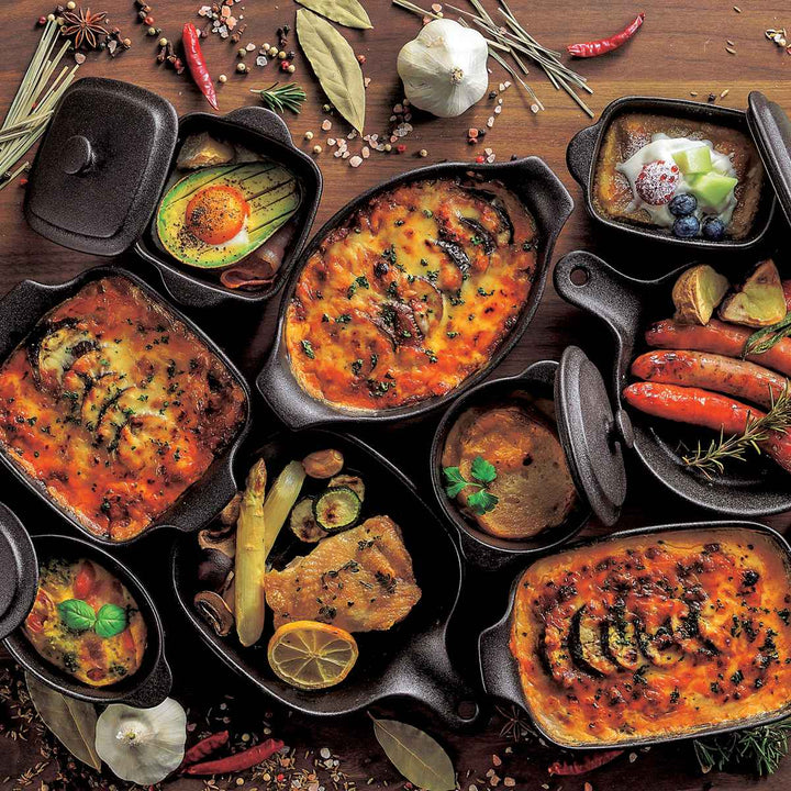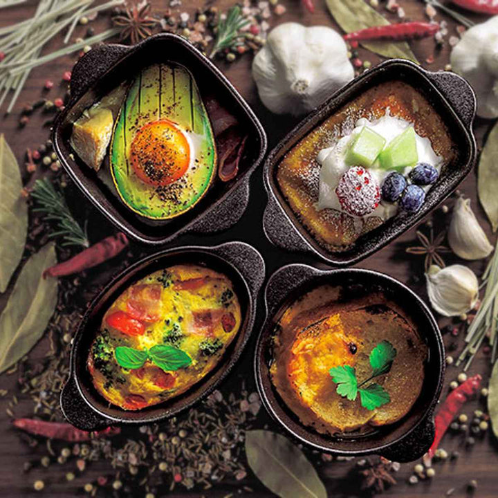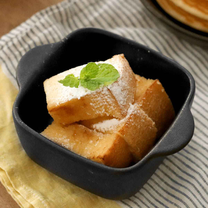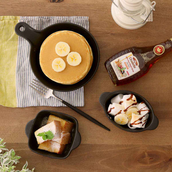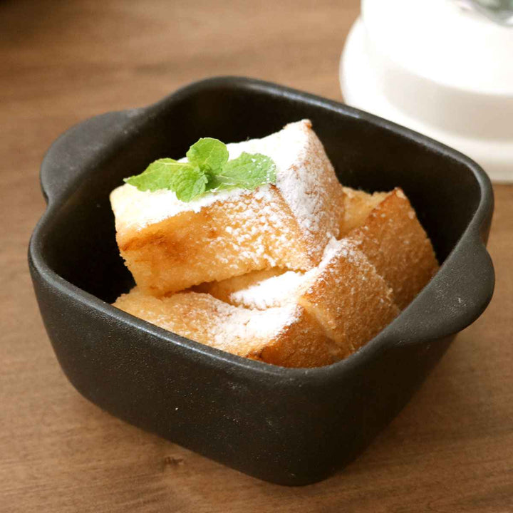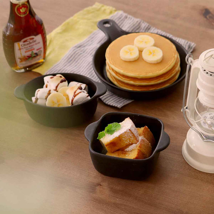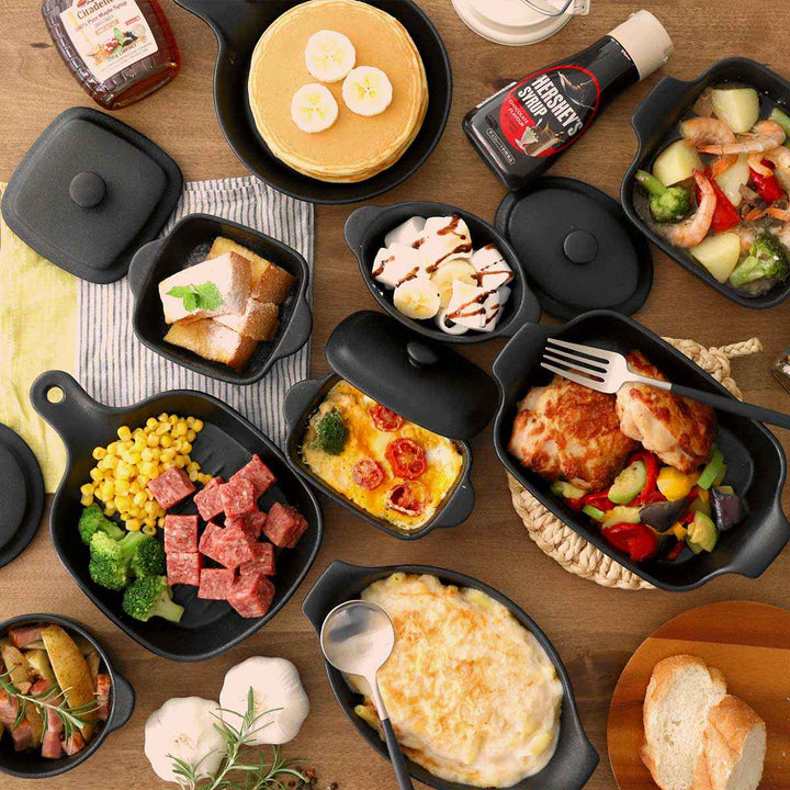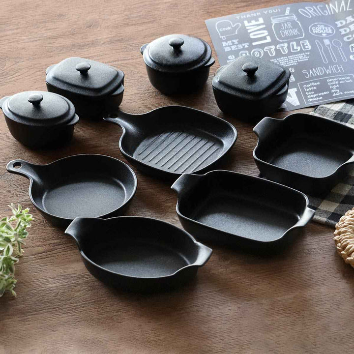 一見スキレットのように見えるオーブンウェアブラックシリーズ。陶磁器製なので鋳物と違い軽く扱いやすい特長があります。家族一人一人のグラタン皿に、みんなに取り分けるサイドディッシュに、ケーキやスイーツにとシリーズで揃えて使い分けたいラインナップです。