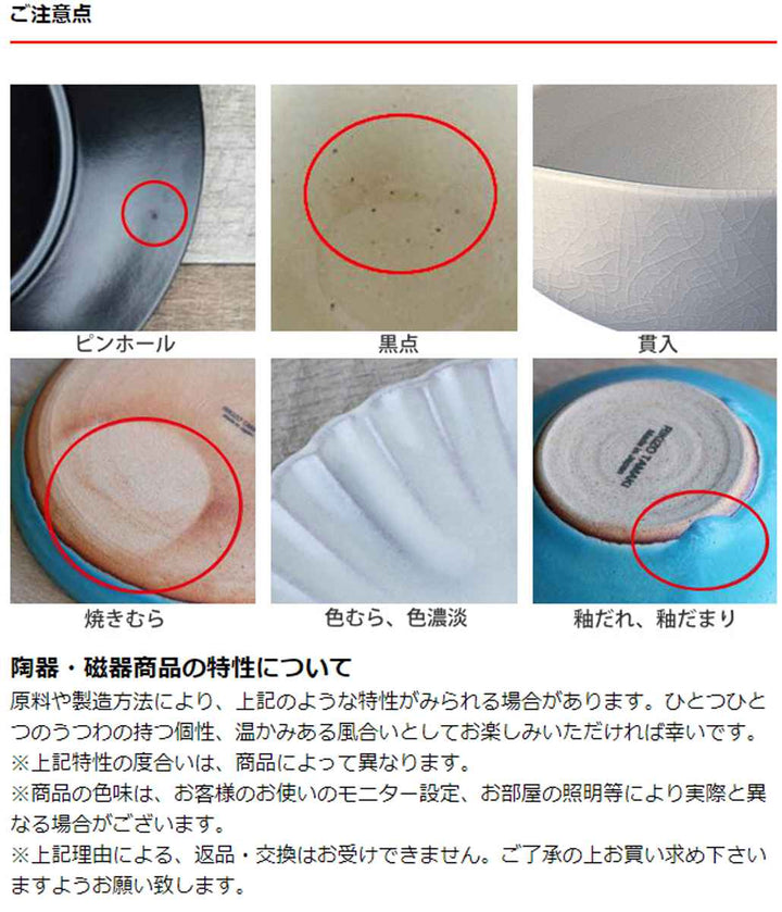 原料や製造方法により、上記のような特性がみられる場合があります。ひとつひとつのうつわの持つ個性、温かみある風合いとしてお楽しみいただければ幸いです。