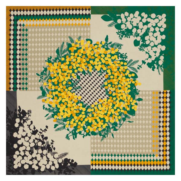 花言葉は、優雅・友情です。シャープなダイヤとストライプの幾何学模様の中に、黄色のつぶつぶが可愛らしいミモザが明るい気持ちを演出してくれる1枚です。