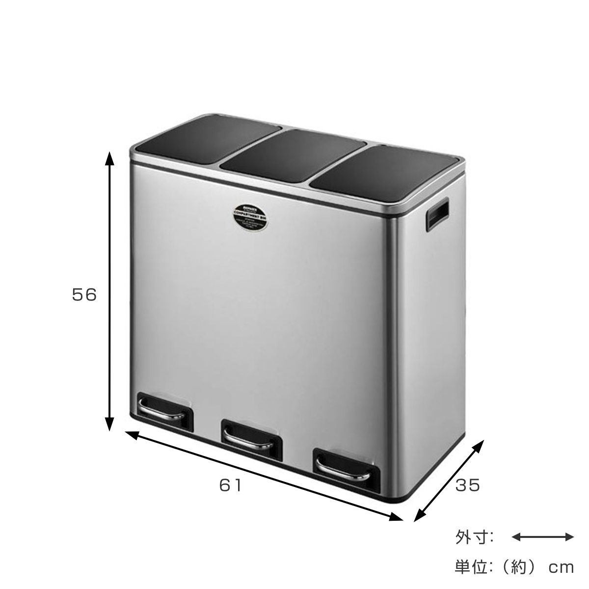 3つ横並びでそれぞれ18Lの容量があります。ビン、缶、ペットボトルなど細かく分別したい時に便利です。それぞれにインナーボックスが付属しているので、お手入れも簡単です。
