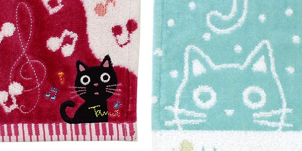 ネコの刺繍と鍵盤ヘムが可愛いタオルハンカチ