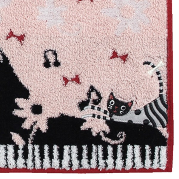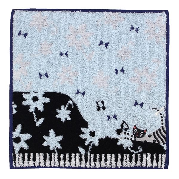 よく見ると、お花が音符になっていて(音符フラワー)今にもピアノを弾きだしそうな猫ちゃんが可愛いタオルハンカチは、自分用にも贈り物にも最適です。猫も音楽も大好きという方にピッタリの1枚です♪
