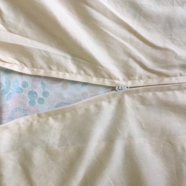 カバーの裏面の中央にファスナーが付いているので、カバーの取替えが簡単です。布団を止めておくひもも付いているので、布団のズレを防いでくれます。