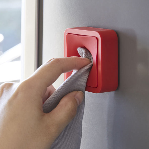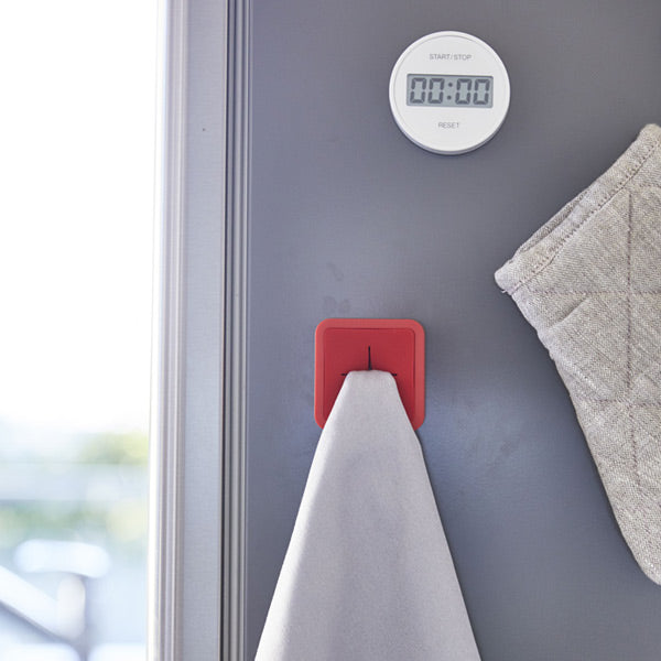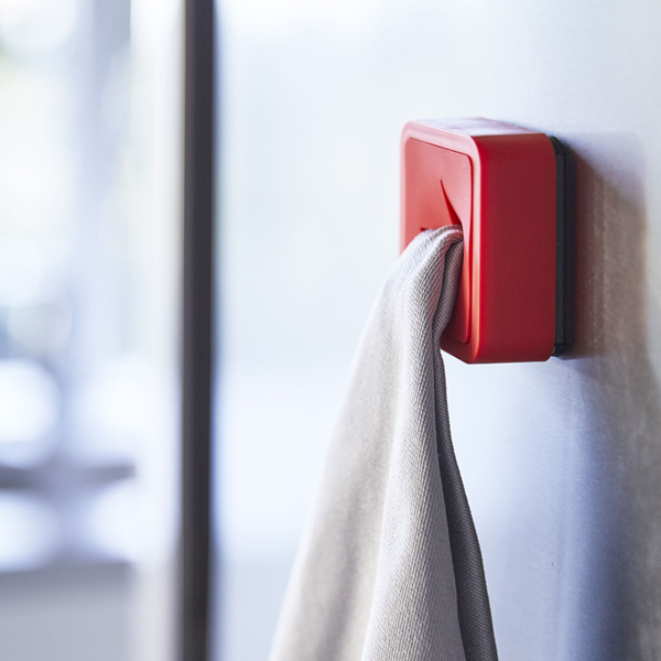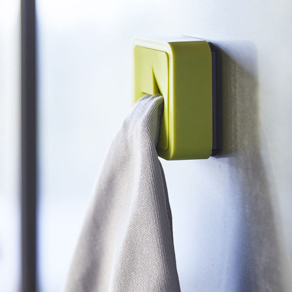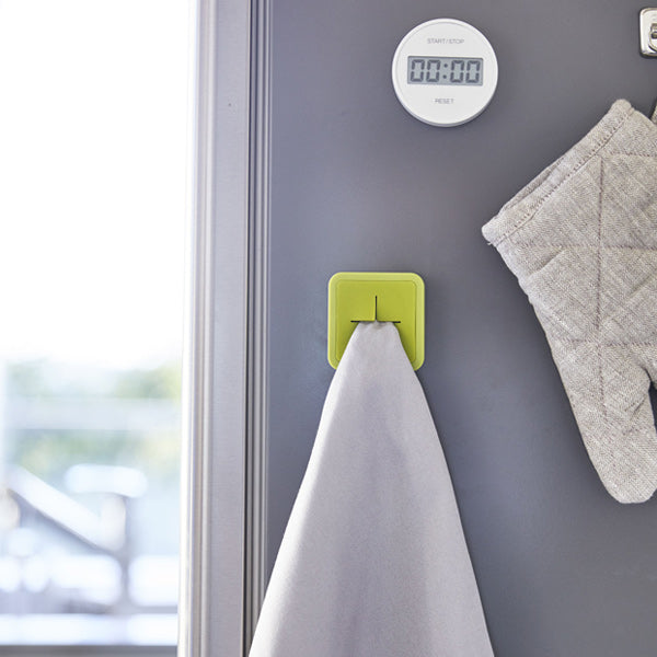 指で本体に押し込むだけ、これだけで簡単にタオルや布巾を取り付けることができます。マグネットタイプなので、磁石がくっつく冷蔵庫、洗濯機などの好きな場所につけて便利にお使いいただけます。