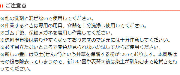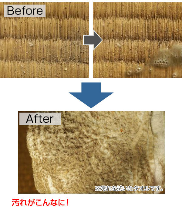 ※新しい畳には染土(せんど)という井草を保護する粉がついております。本商品はその粉も除去してしまうので、新しい畳や表替え後は染土が馴染むまで乾拭きを行ってください。