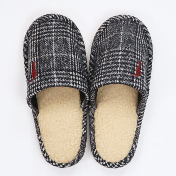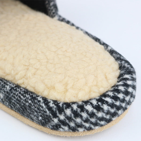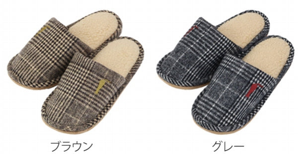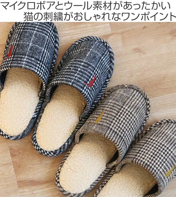 グレンチェック柄の甲部分には、ウールを使用した生地を採用。温かみのある生地感です。また猫の刺繍には光沢のある糸を使用、高級感があります。