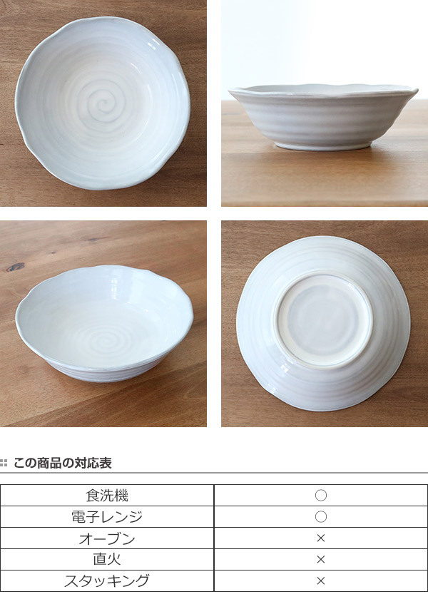 裏面まで釉薬が塗られ、つるりとした質感です。渦巻き柄の素地が見えるデザインが食卓のアクセントになります。電子レンジ・食洗機にも対応しているので、調理やお手入れも楽ちんです。