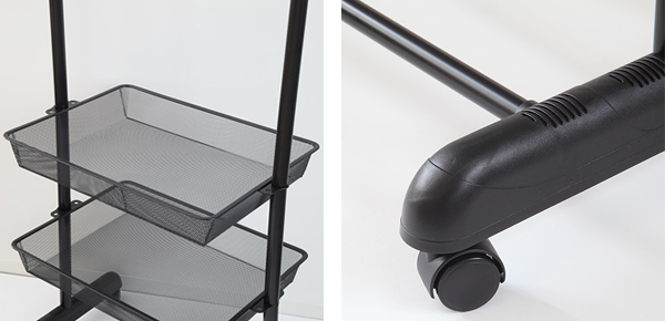 ブラックスチールに粉体塗装を施し、マットな質感に仕上げたハンガーラックです。メッシュ仕様の棚には、服やバッグをディスプレイ感覚で並べてスタイリッシュに収納することができます。