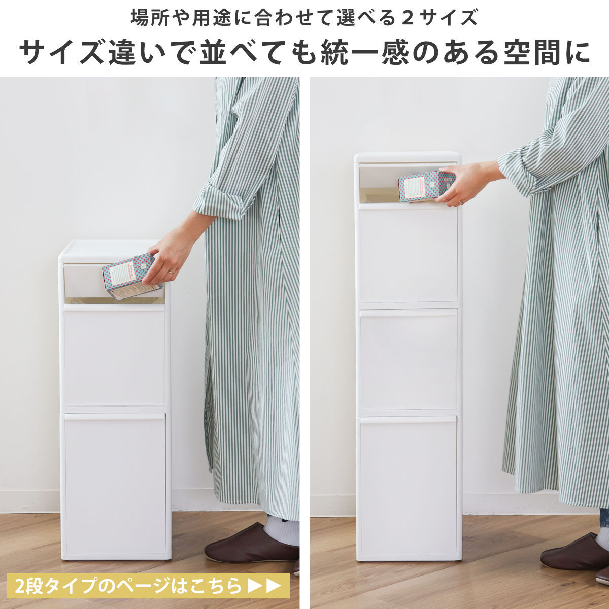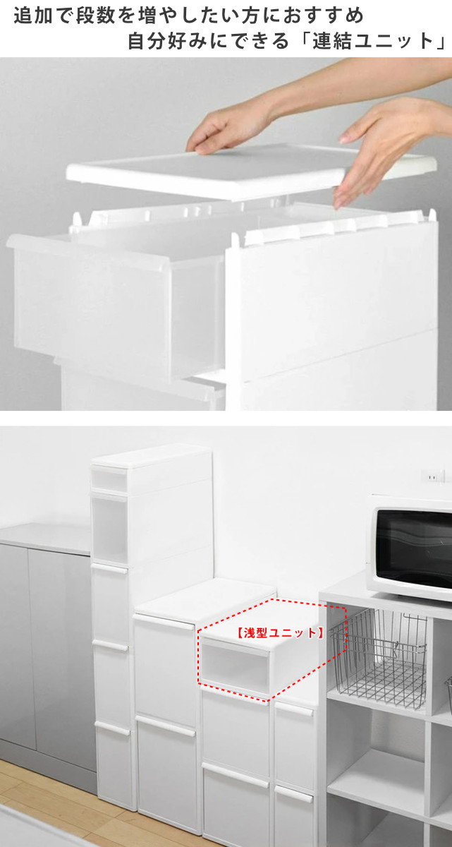 追加で段数を増やしたい方は、連結ユニットを組み合わせて、自由にカスタマイズができます。引き出しの色はホワイトと半透明、高さは4種類の中からお選びいただけます。