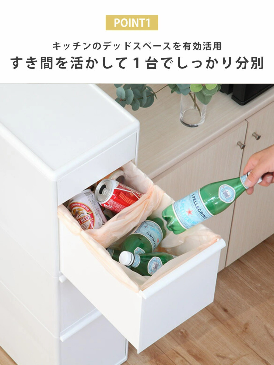 冷蔵庫や食器棚の横にあるちょっとした隙間にも収まるスリムなゴミ箱です。縦型のゴミ箱なので、キッチンのデッドスペースを有効活用して、1台でしっかり分別ができます。