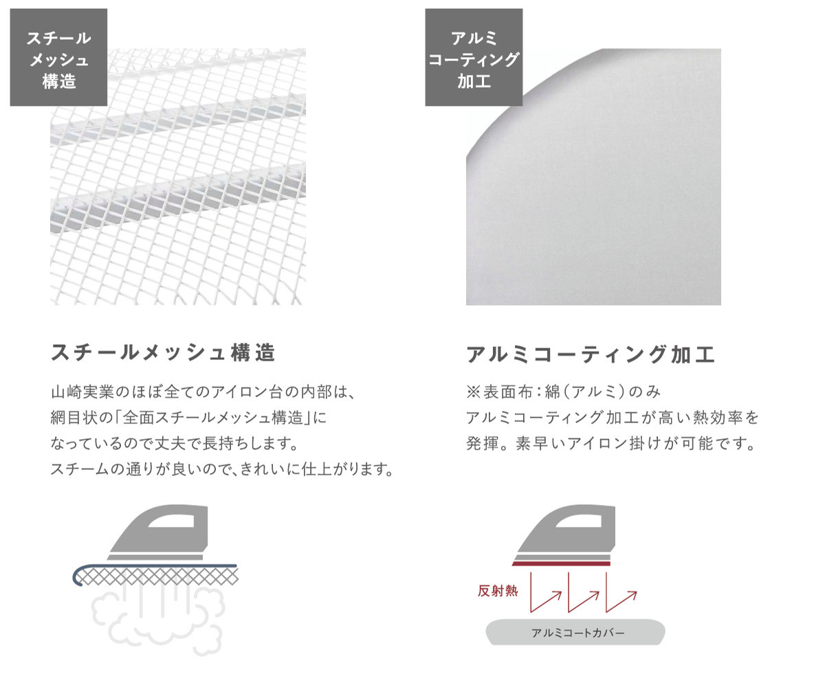 | 材質 | 表面布:綿100%(アルミコーティング) クッション材:ポリエステル 天板・脚部:スチール(粉体塗装) ボタンプレスゾーン:ポリウレタンフォーム アイロン置き台:スチール(クロームメッキ) キャップ:ポリエチレン |