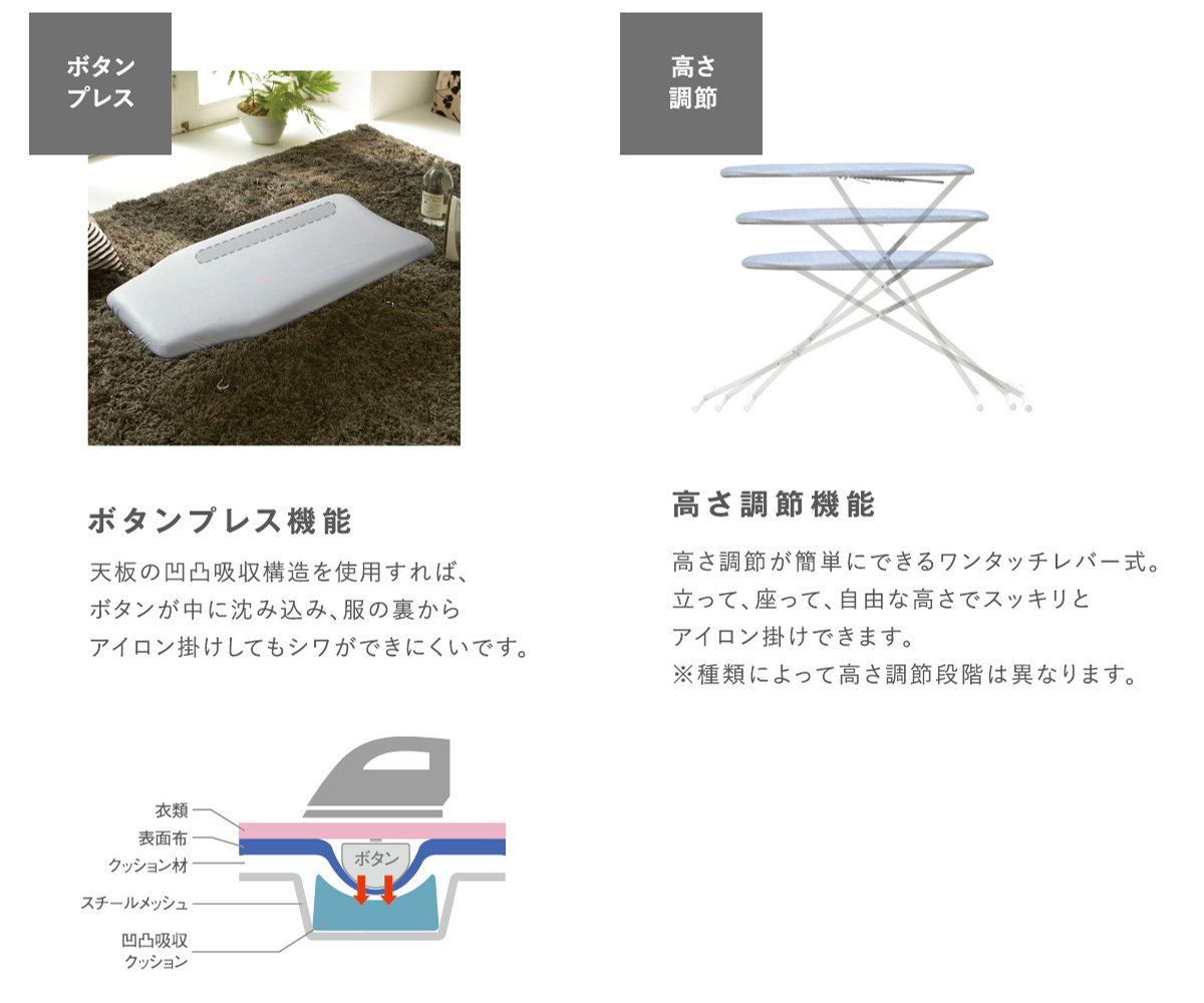 ボタンプレス機能 アイロン台の一部が凹凸吸収構造になっているので、ボタンが沈み込み、アイロン掛けをきれいに仕上げることが可能です。 |