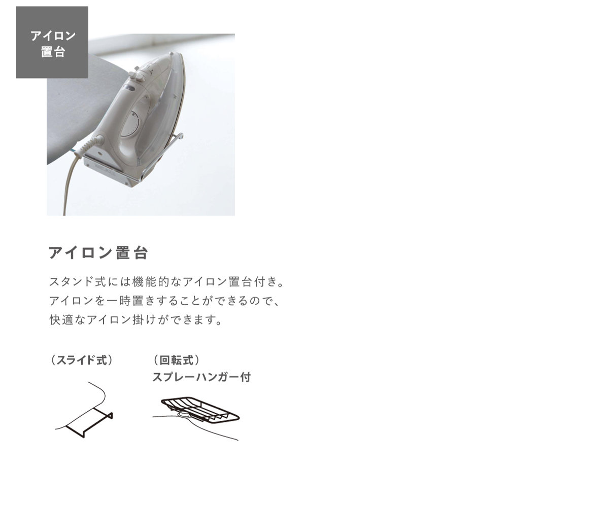 スライド式アイロン置き台 出し入れしやすいスライド式のアイロン置き台は、使わない時はしまっておけるのでとても便利です。 |