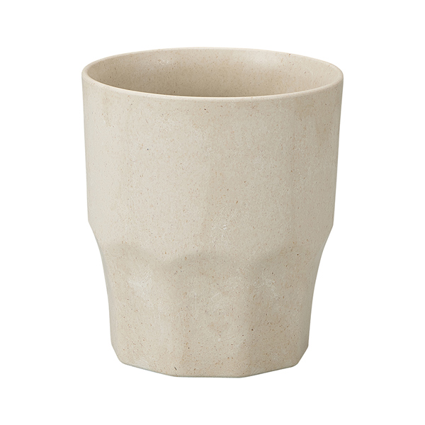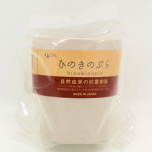 「ひのき」の木粉とプラスチックを使用したカップです。表面の細かい繊維が「ひのき」の木粉で、素朴なカラーとデザインが特徴です。スタッキングもでき、割れにくい素材なので、小さなお子様やお年寄りの普段使いのカップとしてもおすすめです。食洗器・電子レンジにも対応しています。