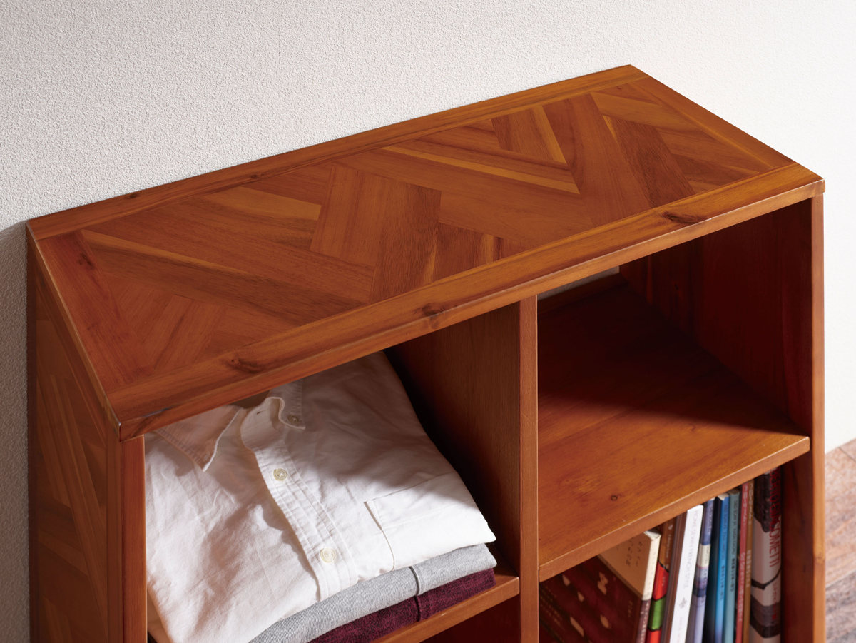 幾何学的な寄木柄の天板がアクセントのオープンラックです。アカシア材特有の濃淡のある木目を活かした個性的なデザインは、置くだけでお部屋の主役になります。