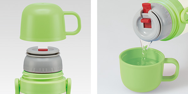 小さなお子様でも飲みやすいコップタイプ蓋と中栓を付けると、コップ飲みの水筒になります。温かい飲み物や冷たい飲み物にもご使用いただけます。