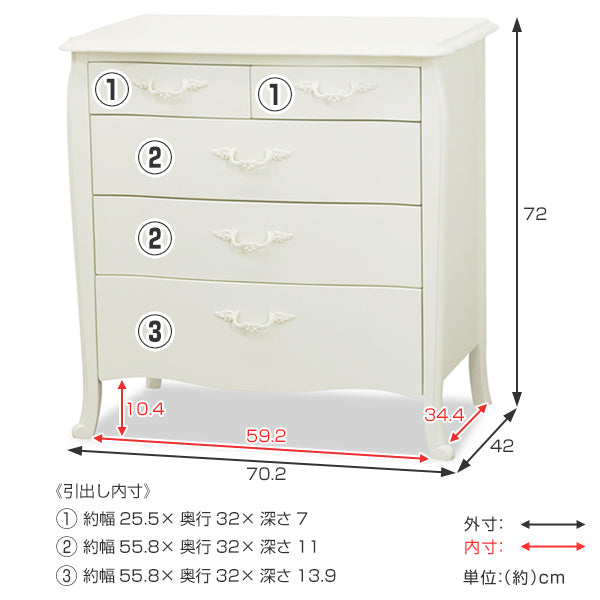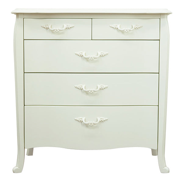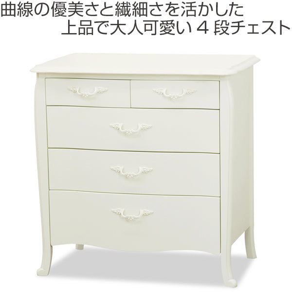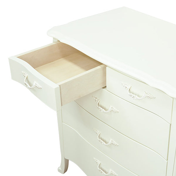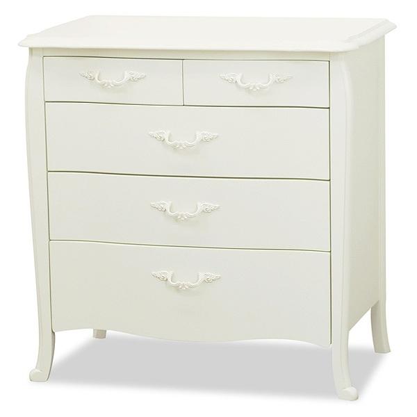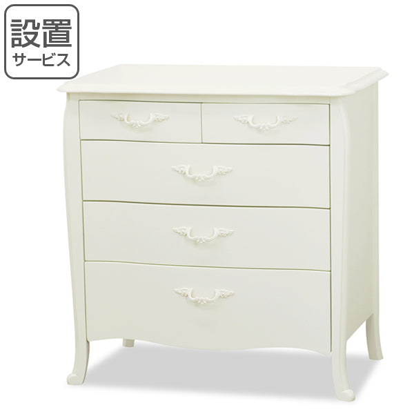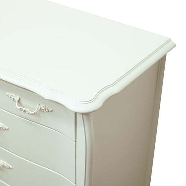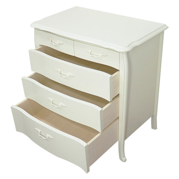 ロココ調デザインの優美さと繊細さ、流線の美しさを活かしたチェストです。手彫りの彫刻や猫脚が洗練された上品な印象を与え、フェミニンな空間を演出してくれます。