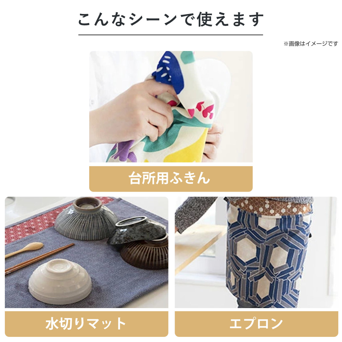 吸水性の良い日本産の染糸を使っているので、食器を拭く布巾や水切りマットなど、キッチン用品としてはもちろん、様々な場面でお使いいただけます。腰に巻けばエプロンとしてもご使用いただけるので、工夫次第で使い方は十人十色です。