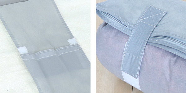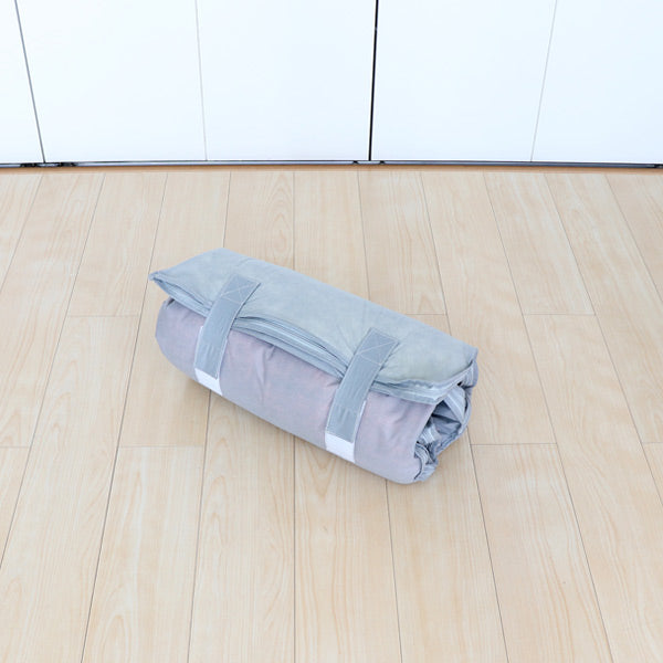 布団をベルトに挟み、ファスナーを閉めて丸めてベルトをとめます。クローゼット内の狭い空間でも収納可能です。