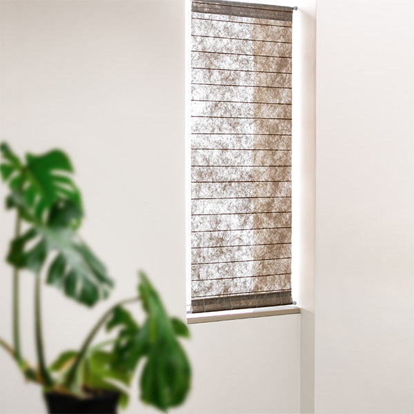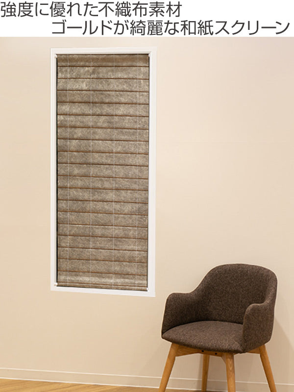 強度に優れた不織布素材で光を遮るのではなく、和らげて拡散させる和紙風スクリーンです。見た目は和紙に見えますが、素材は不織布なので、お子様のいらずらやネコなどの動物が引っかいても破れにくくなっています。ゴールドが綺麗に使われており、他のインテリアとも調和しやすく、和室にも洋室にも馴染むスクリーンです。