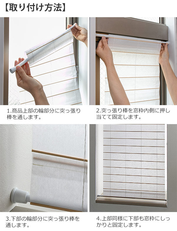 スクリーンに突っ張り棒を通し、窓枠に固定するだけで設置完了です。窓枠に穴を開けず、工具を使いネジで止める必要もないので、女性1人でも手軽に設置できます。