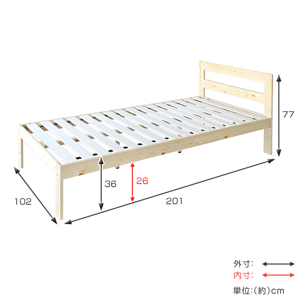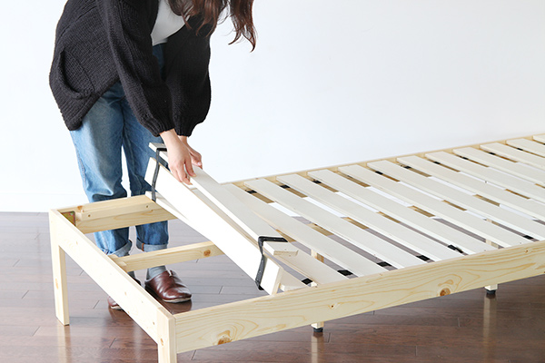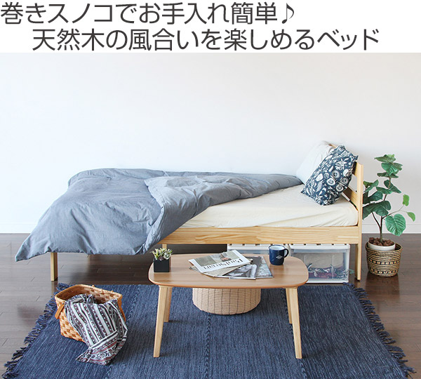 パイン材を使用した天然木の温かみのある自然な風合いのベッドです。床は通気性の良いすのこ仕様なので湿気を溜めこみません。カビや雑菌が多く発生する梅雨や、湿気のたまりやすい冬などでも快適に使用して頂けます。巻き型のすのこなので組み立てや、お手入れが簡単にできます。