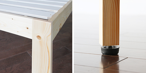 強度面を考慮した構造 強度面を考慮し、ベッドフレーム(4本脚)+中央(2本脚)の合計6本脚構造になっています。中央の脚にはアジャスターが付いています。 |