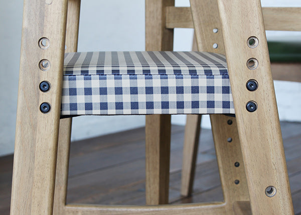 木材の丸みとギンガムチェック柄の座面がお洒落なハイチェアで、ダイニングでのアクセントにもなります。