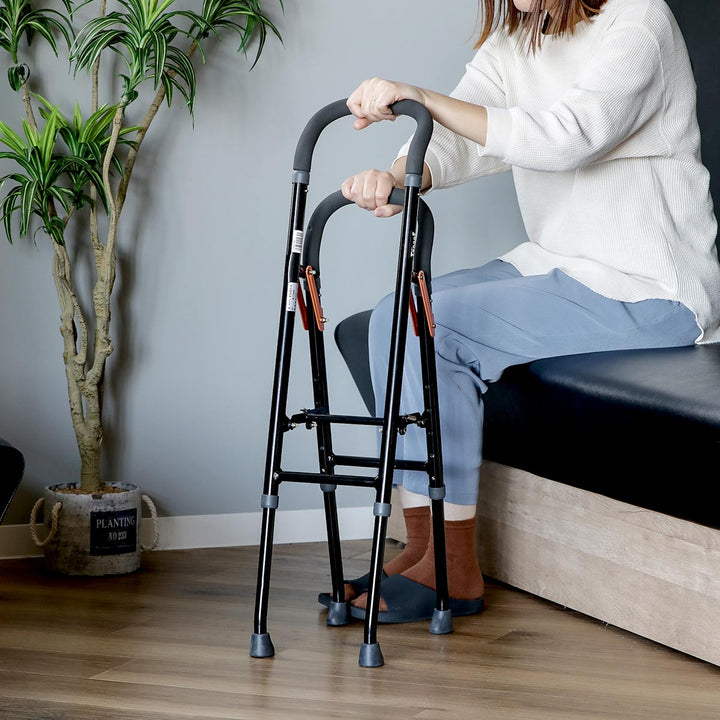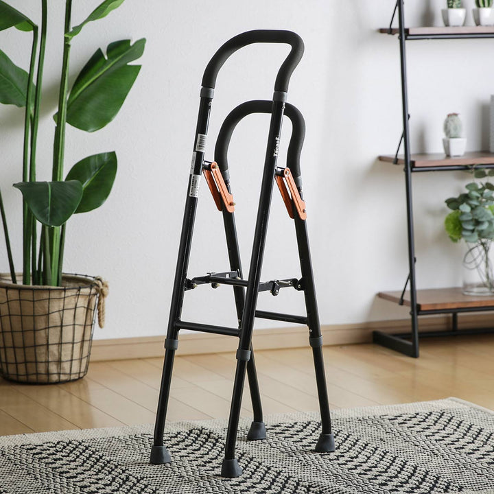 ソファやベッド、トイレなど、移動した先での「つかまる・立ち上がる」を2つのグリップでサポートします。高さが違うため、座った時も立った時もどちらの姿勢でも握りやすいです。