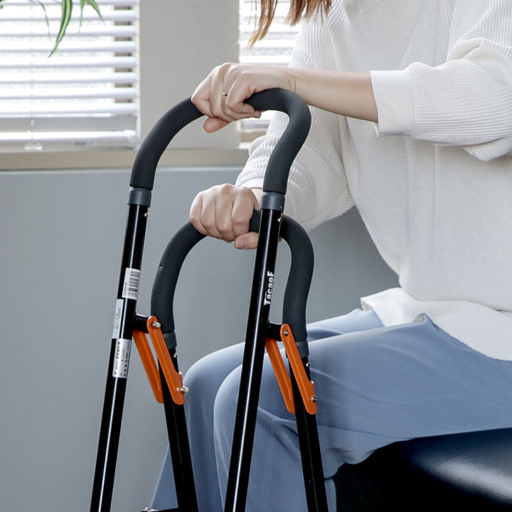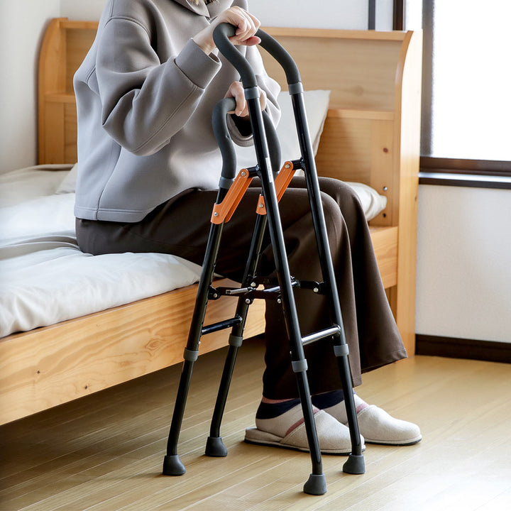 上下のグリップを両手で握り、立ち上がり補助としてお使いいただけます。ソファやベッドサイドに置くと、立ち上がり時の腰・膝への負担が軽減されます。