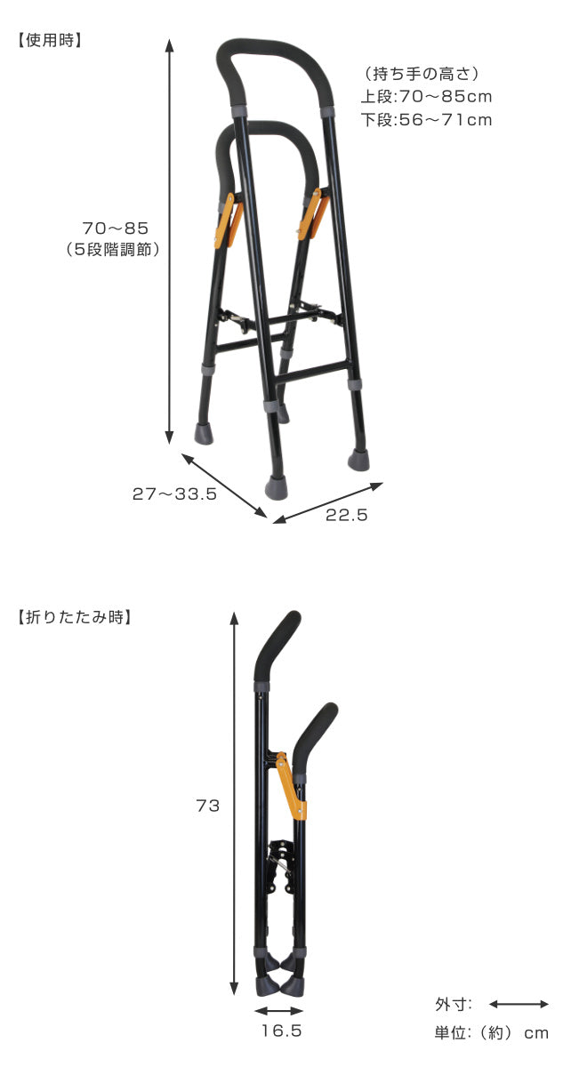 | サイズ | 幅22.5×奥行27~33.5×高さ70~85cm(5段階調節) 折り畳み時:幅22.5×奥行16.5×高さ73cm 持ち手高さ:上段:70~85cm/下段:56~71cm |