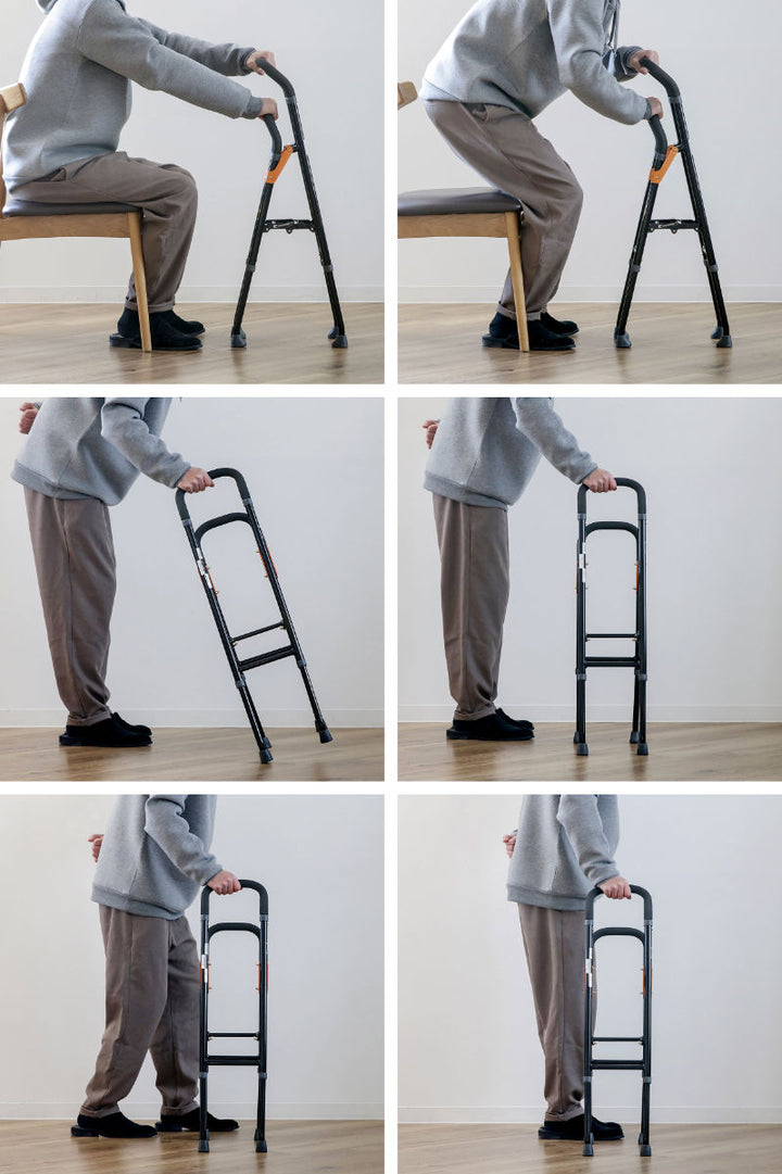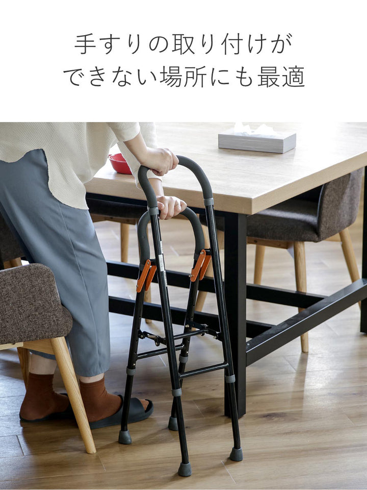 手すりが取付けできない場所だと、テーブルや壁を支えに立ち上ったりすることが多いのではないでしょうか?また移動の先々に設置式の立ち上がり補助を用意するというのも難しいものです。この商品なら、立ち上がりに使い、歩行時に使い、移動先でもまた立ち上がりに使えます。家の中での行動をサポートしてくれ、快適に過ごすことができます。
