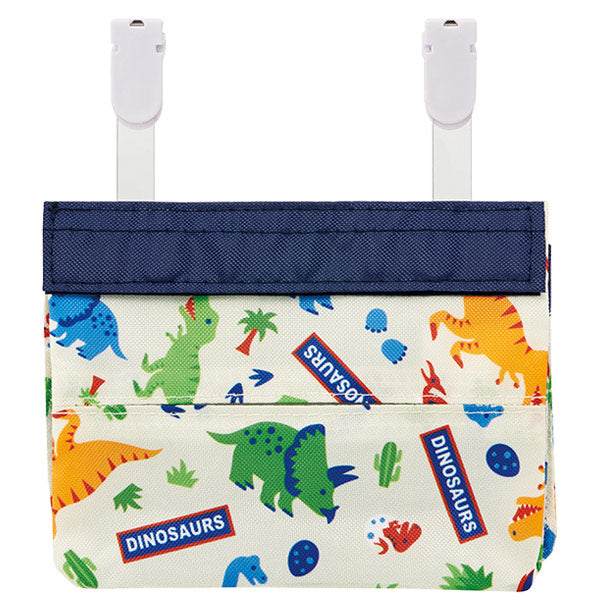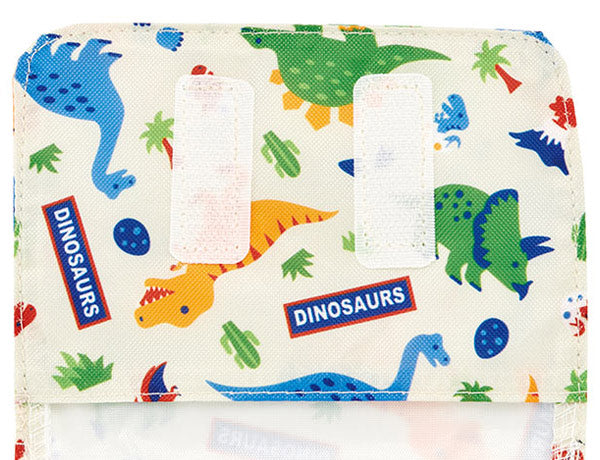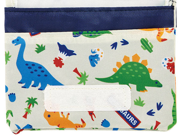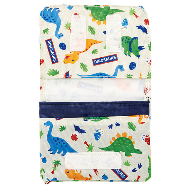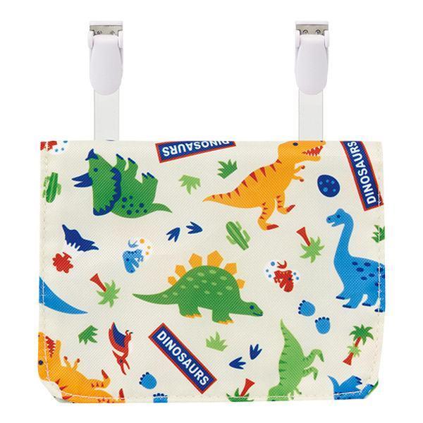 通学やお出かけの際、ハンカチやティッシュなどを持ち歩くのに便利な外付けのポケットです。シンプルな恐竜の絵柄です。