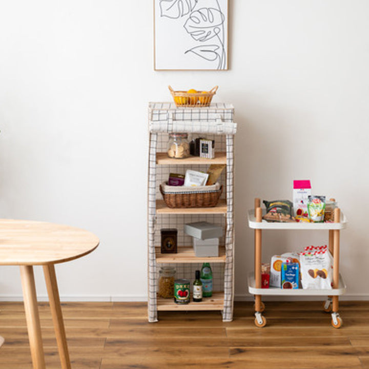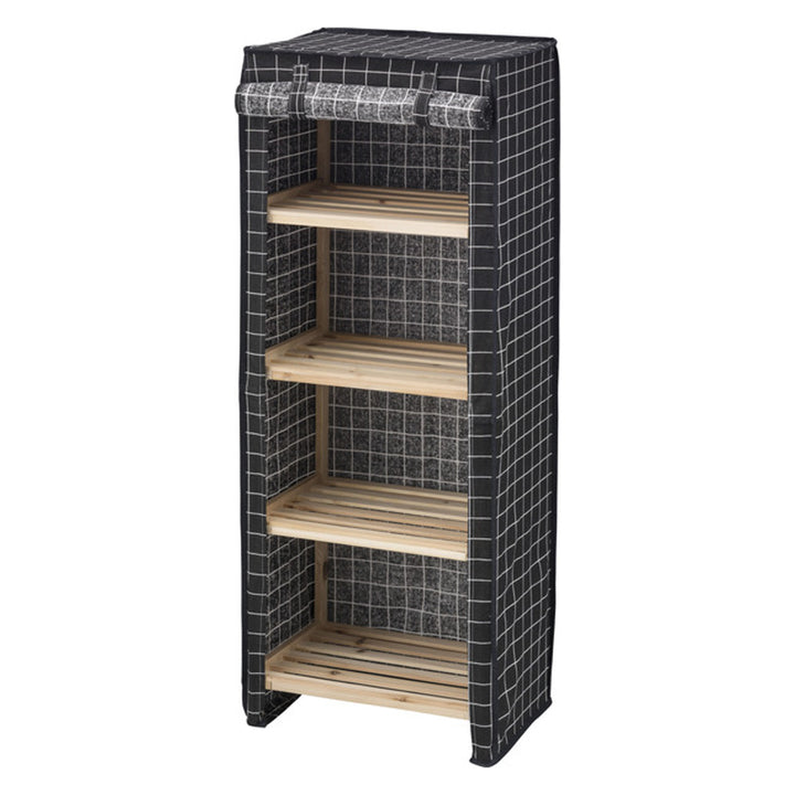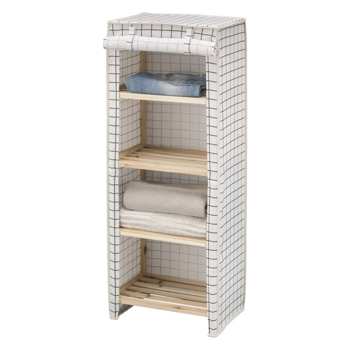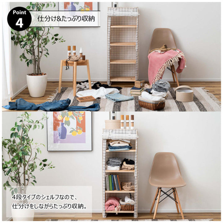タオルや衣類の収納や、食品のストックなど多目的にお使いいただける、4段のウッドラックは一人暮らしのお部屋に丁度良いコンパクトなサイズ感です。ファブリックカバーをかけて、中身を見せずにすっきりと収納できます。