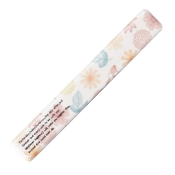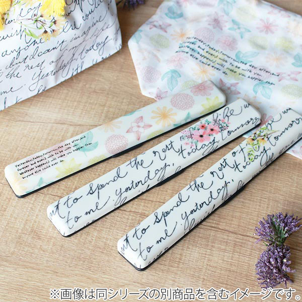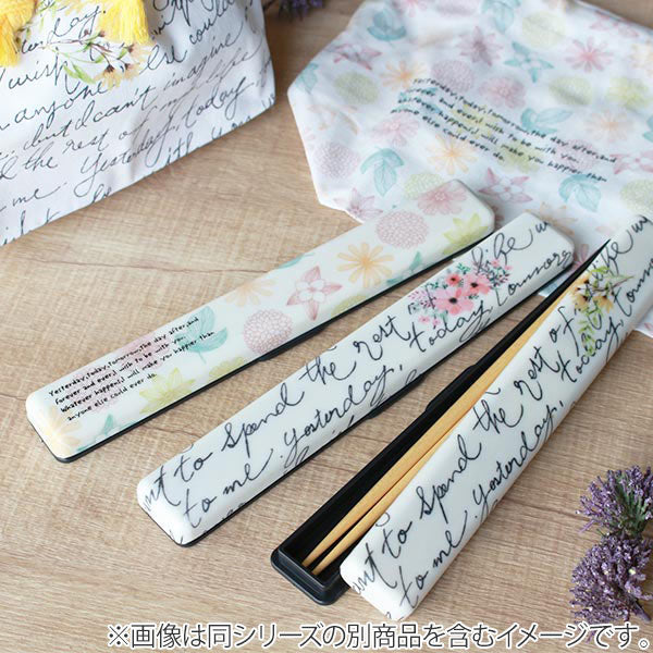 優しい花柄と手書き文字がレイアウトされた可愛らしい箸&箸箱セットです。蓋部分は布貼り加工を施しており、布の風合いを生かした素材感となっており、底部分はブラックカラーなので少し落ち着いた雰囲気です。