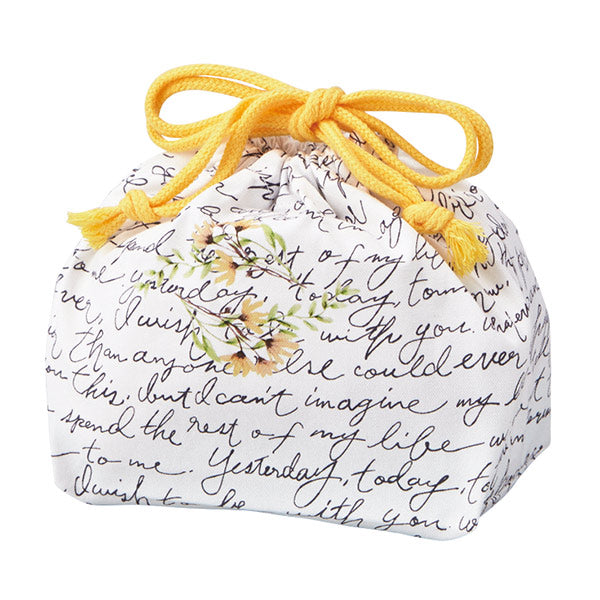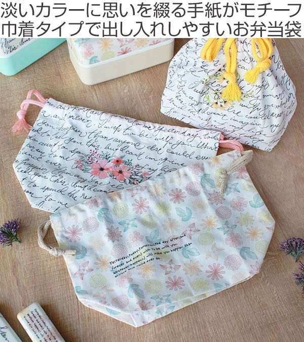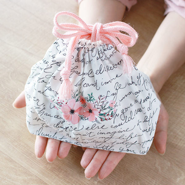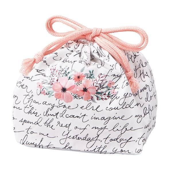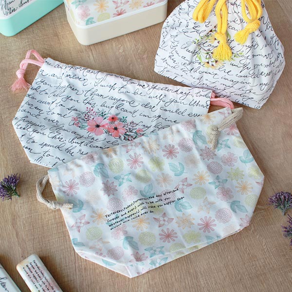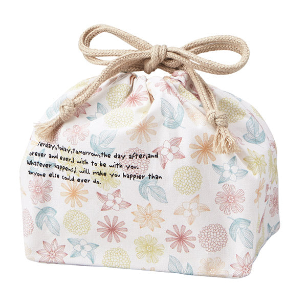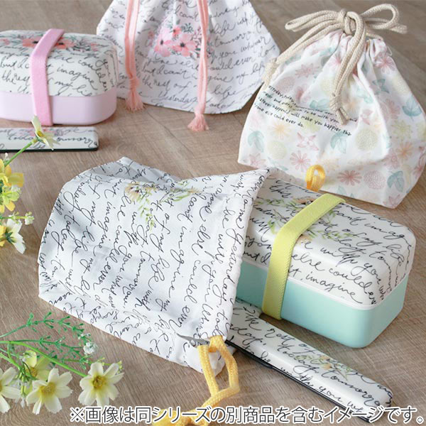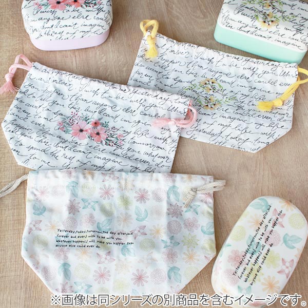 優しい花柄と手書き文字がレイアウトされた可愛らしいお弁当袋です。巾着タイプなので開閉がしやすく、お弁当箱などのランチグッズの出し入れがしやすいです。お弁当袋としてはもちろん、小物を入れたり、ポーチとしてもお使いいただけます。
