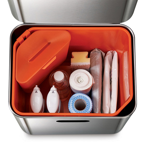 取り外しでき、上下段どちらにも取り付けられる生ごみキャディ付きです。お皿などから直接ごみを捨てやすい広い開口部をしています。また、フタ部分はごみ箱に掛けられる事ができます。